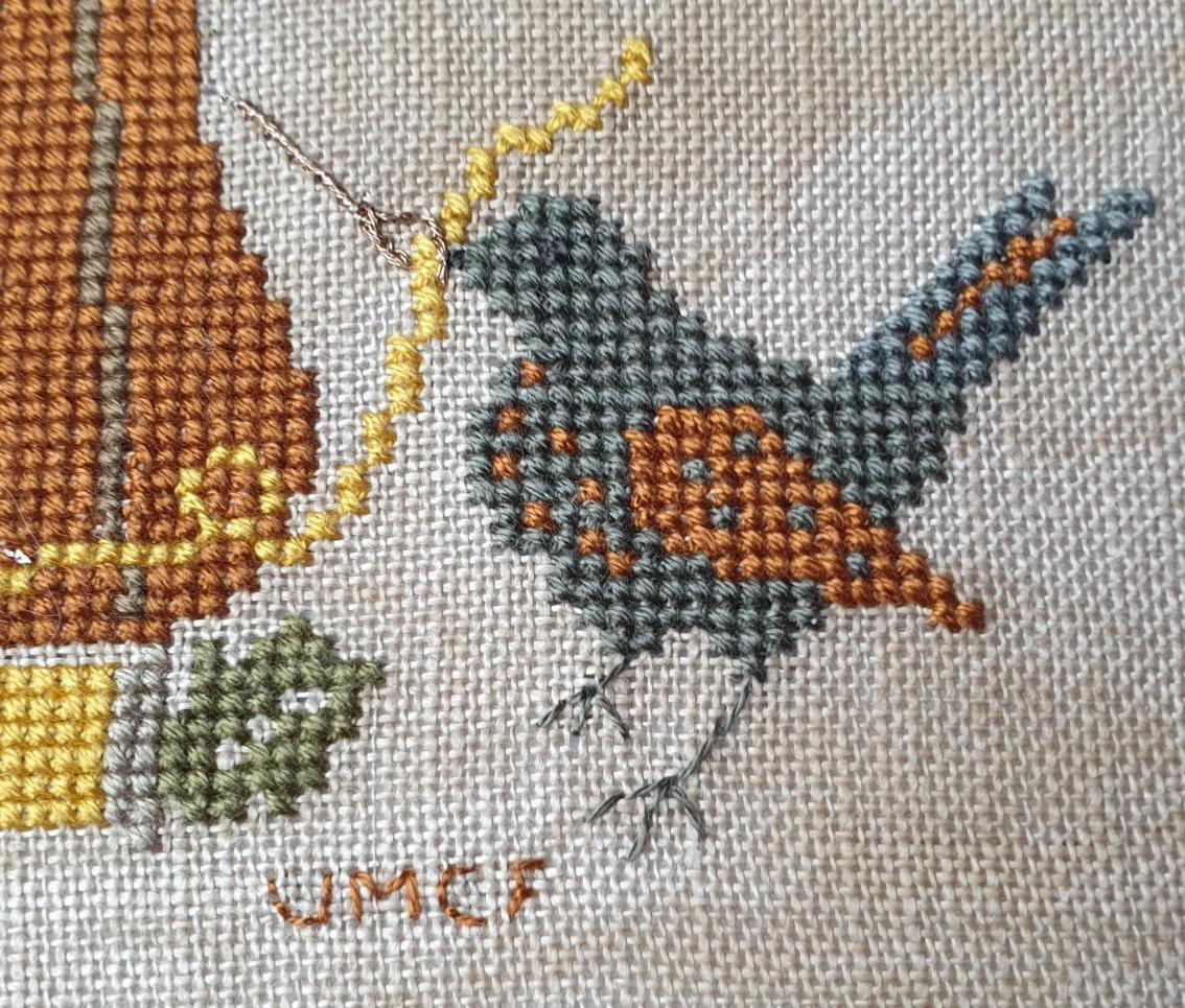 Elle mesure 132 x 59 points. Brodée sur la toile préconisée par la créatrice (Zweigart Belfast Vintage Country Mocha 3009 - 12,6 fils), la broderie mesure environ 21 x 10 cm.